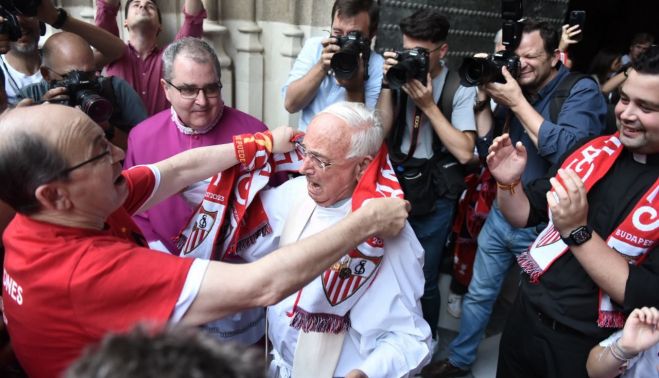 Miembros religiosos de la Catedral saludando al equipo sevillista.