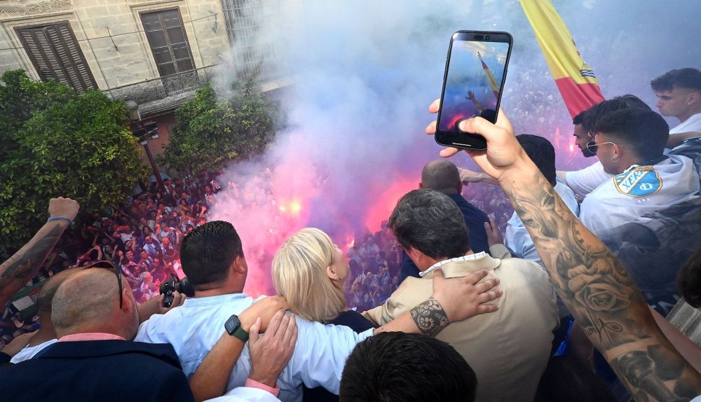 Posteriormente, desde las ocho, la comitiva ha estado en calle Consistorio, accediendo el club al Salón Noble del Ayuntamiento y saliendo al balcón para celebrar con una calle colapsada, una imagen que ha recordado a la Nochevieja de Canal Sur.