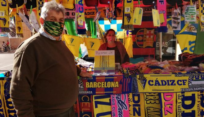A las 12 de la mañana, un pequeño puesto cercano al todavía llamado Estadio Ramón de Carranza coloreaba una esquina de blaugrana, azules y amarillos. Es Antonio Gajardo Jaramillo, un extremeño de Fuente del Maestre (Badajoz) que lleva desde 1988 en el comercio al por mayor de prendas deportivas y accesorios. "Está la cosa mu mala", responde cuando se le pregunta qué tal está. Aunque en seguida matiza que gracias a su fábrica 'Fontextil', ubicada en su pueblo, puede sobrevivir. La empresa de Antonio es la encargada de hacer parte del merchandising de clubs como el Cádiz, el Betis, el Sevilla, el Córdoba Cf y el Osasuna, y para otros de categorías inferiores.