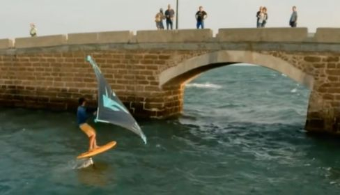 Unas vistas impresionantes ha dejado el paso por el Puente Canal de La Caleta de Antoine Auriol, un kitesurfista francés que ha volado sobre el agua con su tabla.