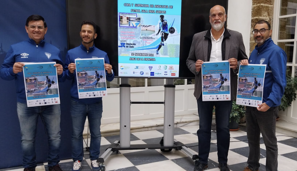 La Diputación de Cádiz ha colaborado con el Club Deportivo de Sordos de Jerez para que la provincia sea sede de la próxima Copa y Supercopa de Andalucía de Fútbol Sala para Sordos, que se disputará el próximo 30 de noviembre en el Pabellón Ruiz Mateos. El diputado de Deportes, Javier Vidal, y el presidente del Club Deportivo de Sordos de Jerez, José Luis Gil, junto con miembros de la directiva y el equipo técnico del club, han presentado a los medios hoy en el Palacio Provincial esta cita inclusiva.