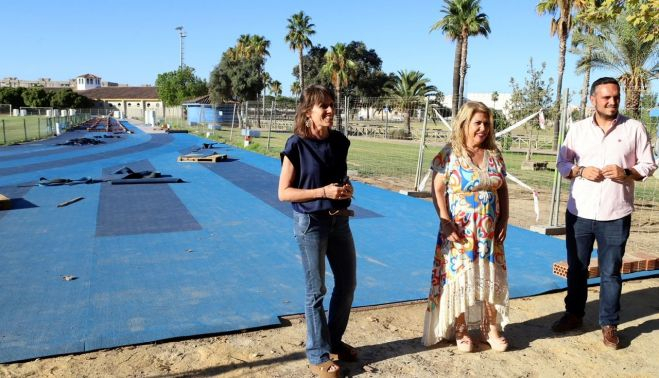 La alcaldesa de Jerez, Mamen Sánchez, junto a la primera teniente de alcaldesa, Laura Álvarez, y al delegado de Deportes y Medio Rural, Jesús Alba, han supervisado la fase final de las obras de renovación de las pistas del anexo a Chapín.
