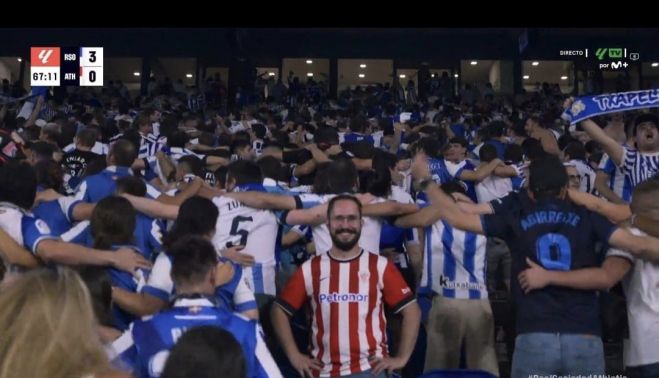 Sin perder la sonrisa a pesar del chaparrón que le acaba de caer a su equipo. Un aficionado del Athletic de Bilbao se ha convertido en viral por su simpática resistencia entre la hinchada de la Real Sociedad.