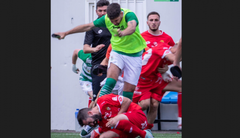 En mitad del partido, un futbolista del equipo local ha enloquecido y ha pateado con mucha violencia a un rival que se encontraba en el suelo. La agresión la ha llevado a cabo delante del árbitro, que no ha dudado en mostrarle la tarjeta roja directa.