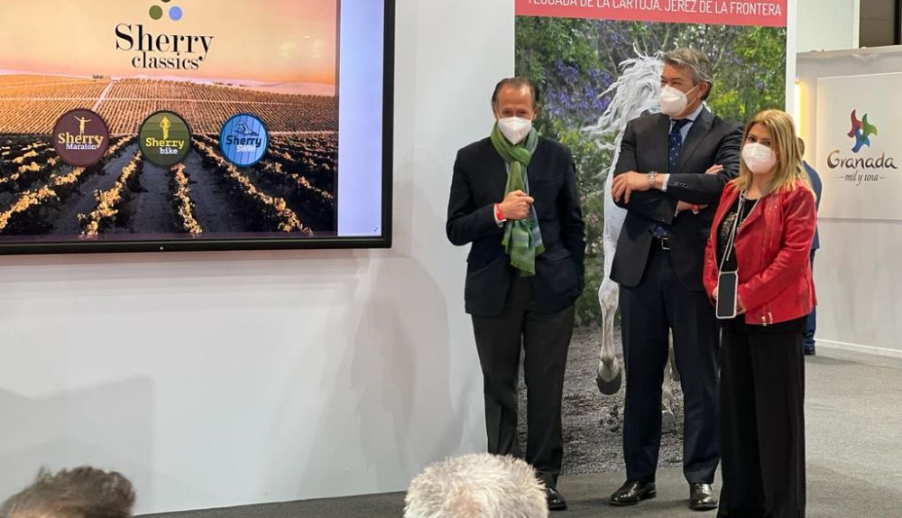 La alcaldesa de Jerez, Mamen Sánchez, junto al vicepresidente de la Diputación, José María Román, y el presidente del Consejo Regulador, César Saldaña, ha participado en Fitur en la presentación de las Sherry Classics 2020, una oferta deportiva que pretende poner en valor uno de los mayores patrimonios de la provincia de Cádiz como es el viñedo del Marco de Jerez.