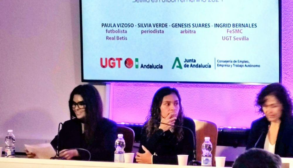Tras la inauguración se celebró la primera Mesa de Debate, en la que la secretaria del sector de Comunicaciones y Cultura de FeSMC UGT Sevilla, Ingrid Bernales, explicó cómo fueron las difíciles negociaciones, en 2020 para concluir en la firma del primer convenio del Fútbol Femenino, que “facilitó la puesta en marcha de la Liga Profesional y, en definitiva, de la profesionalización de las futbolistas en España que, en pocos años, consiguieron en título de Campeonas del Mundo. UGT fue quien impulsó ese convenio. Nada de eso hubiera sucedido si no se hubieran consolidado sus derechos laborales”.