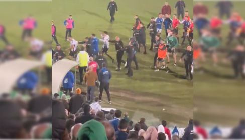 Aficionados del Xerez CD advertían a otros en la grada que se tranquilizaran los últimos segundos del encuentro ante el lanzamiento de algunas botellas, que con el pitido final se transformó en una tangana entre jugadores y cuerpo técnico, con numerosas quejas por la actuación arbitral y la actitud de los jugadores de la Balona.