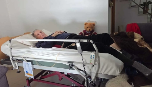 El hombre permanece encamado, no puede caminar ni incorporarse por sí mismo y necesita cama hospitalaria y grúa para su movilización. Desde hace seis años cuentan con un servicio municipal de ayuda a domicilio durante varias horas al día, aunque es su esposa quien asume la mayor parte de los cuidados diarios.