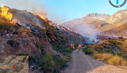 Aunque el fuego no está aún extinguido, los equipos del Infoca continúan trabajando para lograr su control definitivo, tras afectar a una zona de monte bajo poblada de esparto y aulaga, en la vertiente oriental de la Sierra de Gádor, en una franja situada entre los municipios de Huércal, Gádor y Benahadux.
