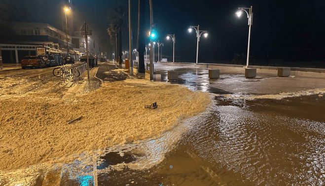 "No es arena. Es espuma de mar. El agua ha alcanzado esta noche el Paseo Marítimo de Cádiz", comentaba en sus redes el periodista Pedro Espinosa junto a varias imágenes del suceso. La subida de la marea ha dejado importantes acumulaciones de espuma en el paseo y la carretera. Por el momento, el chiringuito de la playa que está en peligro por el temporal, sigue conservando su estructura.