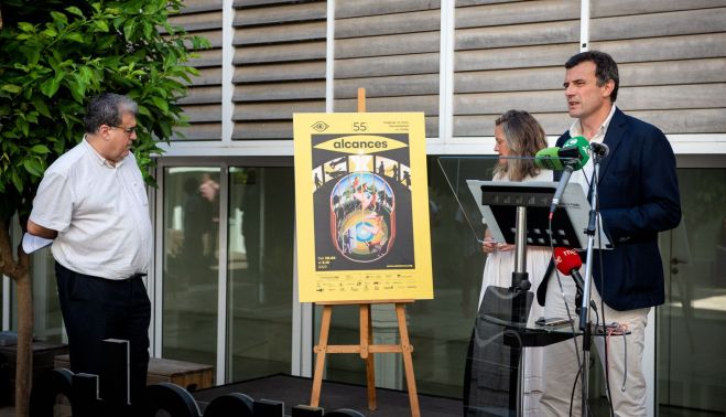 El alcalde de Cádiz, Bruno García, junto a la teniente de alcalde delegada de Cultura del Ayuntamiento de Cádiz, Maite González, y el coordinador y programador del festival, Javier Miranda, han asistido al acto de presentación de la 55 edición de Alcances Festival de Cine Documental, que se celebrará del 28 de septiembre al 6 de octubre en la ciudad.
