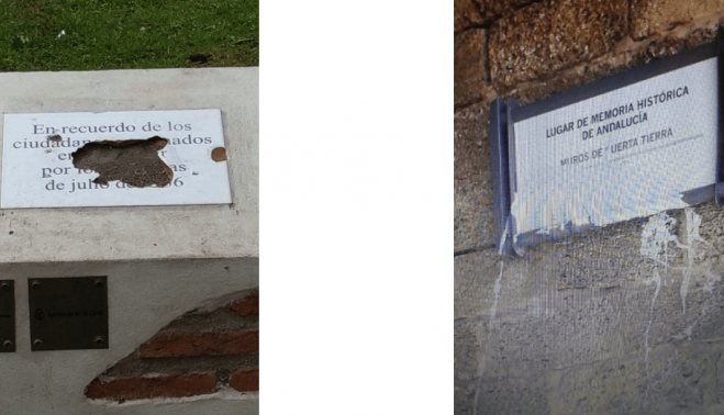 "Son los del odio y el rencor de quienes se sienten aludidos por el recordatorio de que en su foso fueron asesinadas casi 150 personas. Las que mataron los golpistas del verano de 1936", agregan desde la plataforma memorialista. "El miedo es su mejor aliado. La impunidad que da las calles desiertas y la efervescencia de la desmovilización ciudadana les llena el cráneo de burbujas efervescentes. El resultado es un bote o una bolsa de pintura contra la señal de memoria o un martillo, ¿o quizás un palo de golf?, contra la placa", recoge en un comunicado.