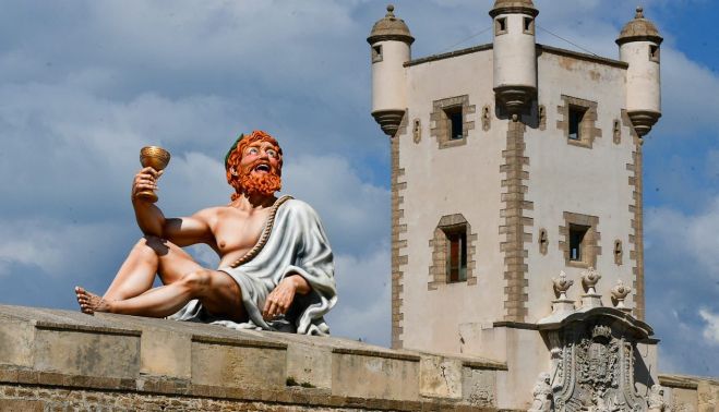 Un Dios Baco pelirrojo, sentado, copa en mano, da la bienvenida a quienes entran desde este sábado al centro histórico de Cádiz, donde se vivirá el Carnaval intensamente de ahora en adelante.