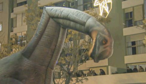 La razón es que en la parte jurásica de la cabalgata, con presencia de dinosaurios, uno de ellos es un diplodocus. En la retransmisión se advierte que sería un brachiosaurus, pero en cualquier caso, de esa familia del cuello largo, como las jirafas pero mucho más anchos, como eran los 'bichos' entonces.