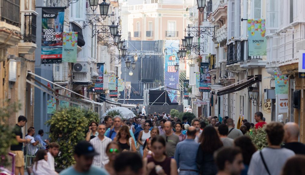 Algo menos de aglomeraciones pero nuevo lleno en el casco antiguo de Cádiz para despedir a la convocatoria de la SailGP 2023. Con todos los establecimientos llenos, con la amenaza de lluvia prorrogada, el perfil de la vieja ciudad que mira a la Bahía de Cádiz volvió a vivir una jornada de celebración, menor a la del sábado, pero beneficiosa para su autoestima y para la microeconomía local.