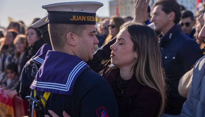 Cuando llega el marinero forma una piña con su padre, su madre y su hermana. Se escucha decir "nos vemos pronto, cariño, y acuérdate de..." bajan el tono y pegan la boca a la oreja del que se va. Mejor apartarse y respetar el momento familiar, de eso va este año la salida de buque-escuela de la Armada Española.