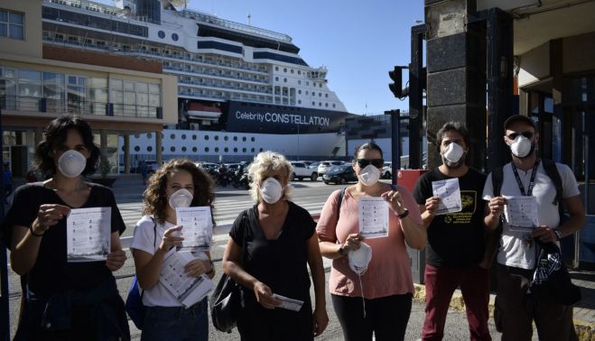 El colectivo Calle Viva reparte mascarillas a cruceristas y residentes alertando de la contaminación. “La ciudad de Cádiz supera uno de cada nueve días los niveles de contaminación permitidos”, apuntan. “Es absurdo limitar vehículos e industrias contaminantes mientras existen estos artefactos de supercontaminación en el centro de la ciudad”, añade la organización.