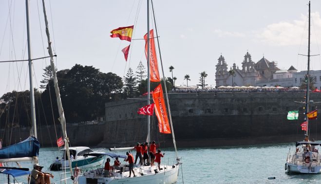 Las filas de espectadores son triples, cuádruples, cuando los veleros reciben la señal de salida. Banderitas y bufandas de varios países, un banderón de España, mucho polo rojo, algunos prismáticos, miles de gafas de sol. Hay una carrera de barcos, dicen, pero en realidad es la justificación para celebrar otra vez la misma ciudad y su comunión con el mar omnipresente. "Mira, mira, ahí va España", grita Macarena López, portuense y uniformada con sus hijos.