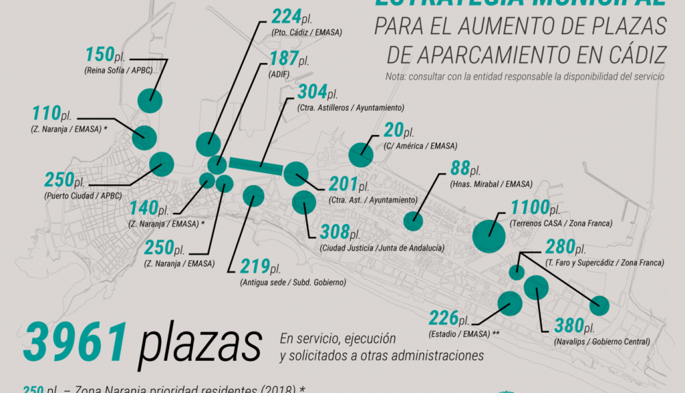 En cuanto al Gobierno central, en el solar de la antigua Subdelegación del Gobierno podría habilitarse un aparcamiento en superficie para 219 plazas, 380 plazas más de aparcamiento en el solar de Navalips y 1.100 plazas más en los antiguos terrenos de CASA en el que estaba proyectado el nuevo hospital y que son propiedad de la Zona Franca. A ellos se suman los 280 aparcamientos que la Zona Franca ha mostrado disposición de habilitar en los terrenos de los antiguos Talleres Faro y Súper Cádiz.