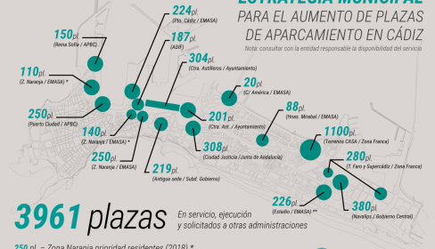 El mapa elaborado por los técnicos municipales sobre los aparcamientos que pueden ponerse a disposición en la ciudad incluye las 304 plazas que se ponen en servicio hoy en la carretera industrial de manera absolutamente gratuita para la ciudadanía. Asimismo, se van a poner en servicio otras 224 plazas en el puerto de Cádiz, en un suelo que la Autoridad Portuaria Bahía de Cádiz (APBC) ha alquilado a Emasa. Estará operativo en cuanto se ultimen los trabajos para la adecuación de los accesos y otros detalles para su funcionamiento automatizado.