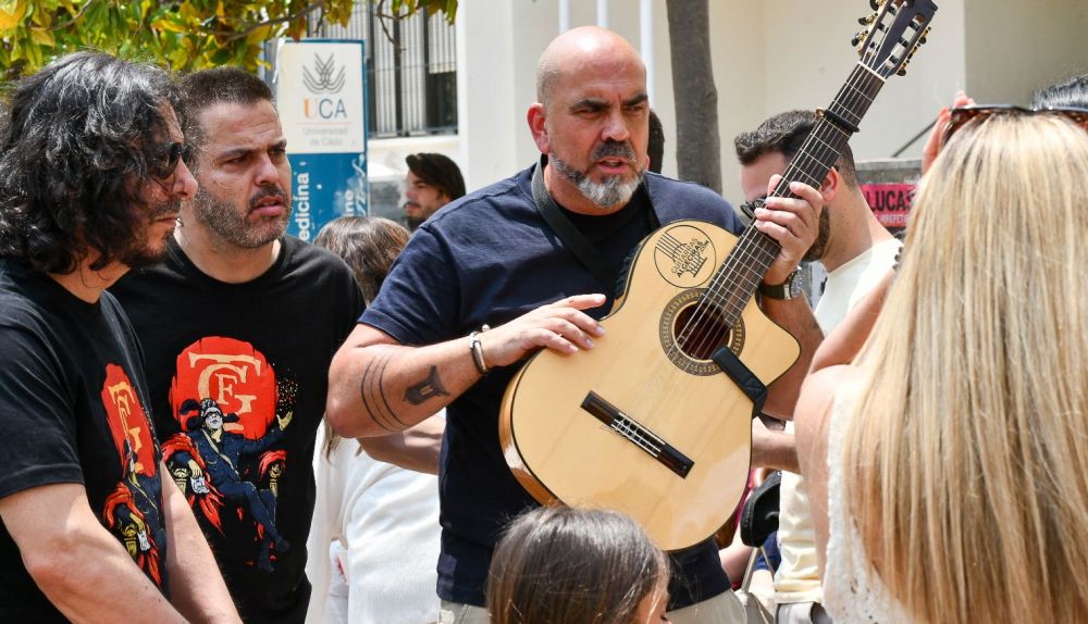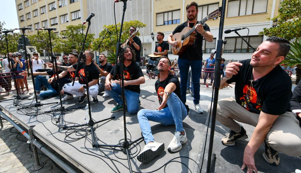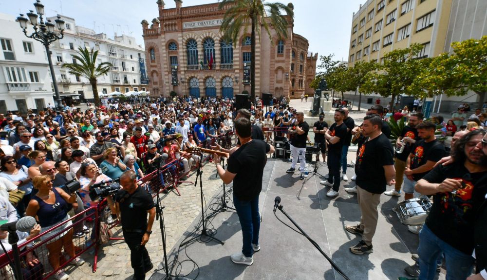 Un tablao en la plaza Fragela, ante el Gran Teatro Falla que tanta pasión le provocó al autor -y viceversa-, recibió a su último grupo antológico, La eterna banda del Capitán Veneno.