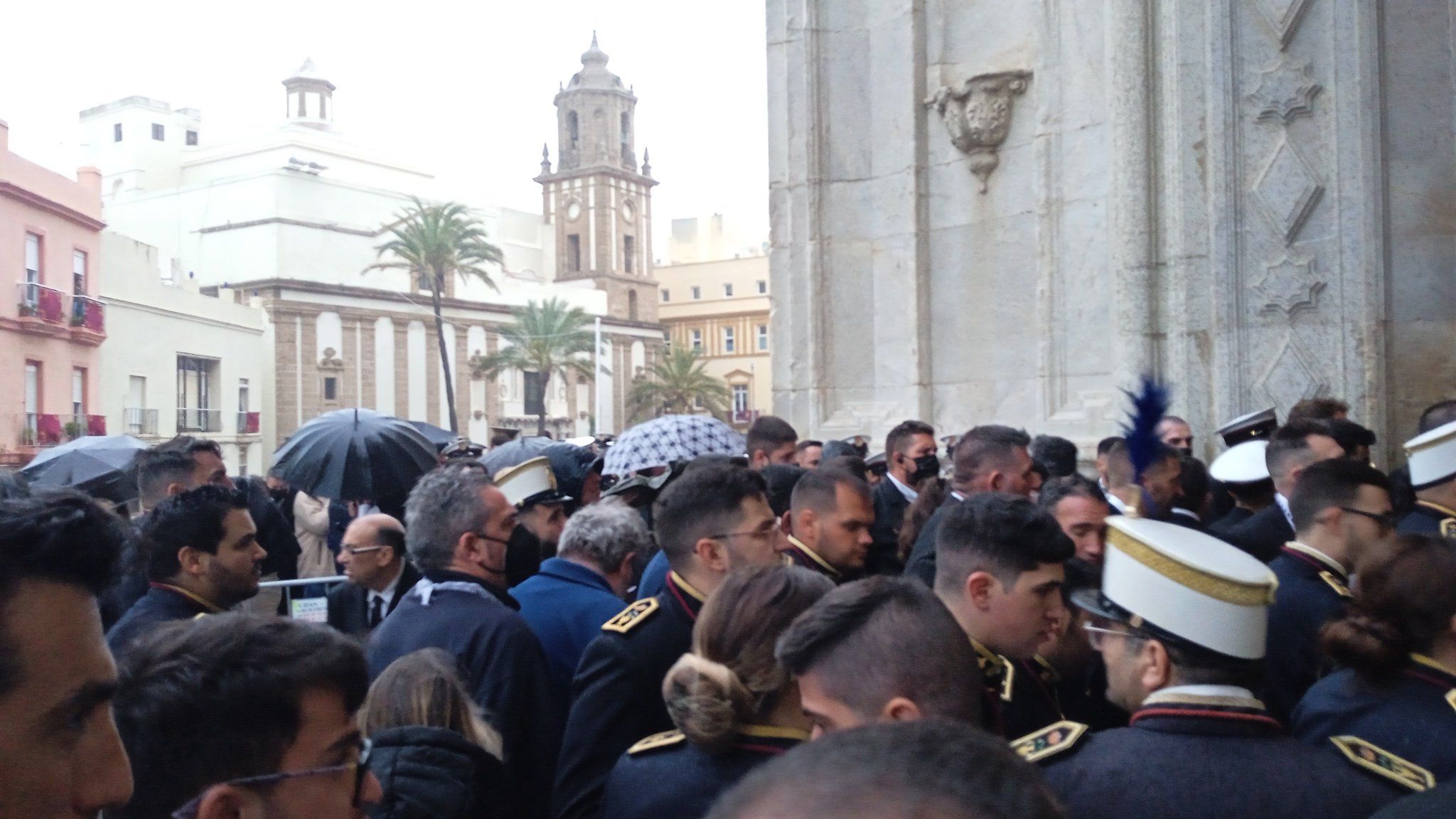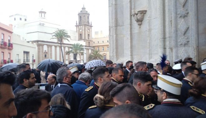 Las precipitaciones provocaron el caos a las puertas de la Catedral de Cádiz el Lunes Santo. La lluvia caía sobre el cortejo de las profesiones que intentaban pasar para resguardarse y poder ver a su paso. Sin embargo, no todos llegaron a entrar, la orquesta de músicos se quedó horas y horas aguardando a la puerta de la catedral aguantando las precipitaciones.