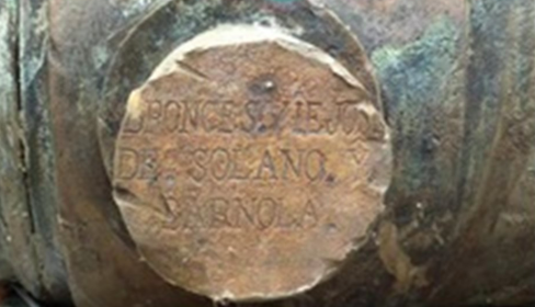 Además, en los muñones puede leerse el peso de la pieza, en libras españolas, que es de 2.725 libras, es decir, algo más de 1.234 kilos, así como los datos correspondientes al material y fundidor "Bronces viejos de Solano y Barnola".