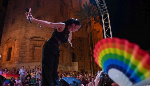 En ese tablao, la cantante malagueña María Peláe ofrece poco después de las diez de la noche el pregón que abre el calendario de actos del Orgullo Lgtbi, llamado este año Orgullo de Cadi Cadi, hasta el próximo 28 de junio.
