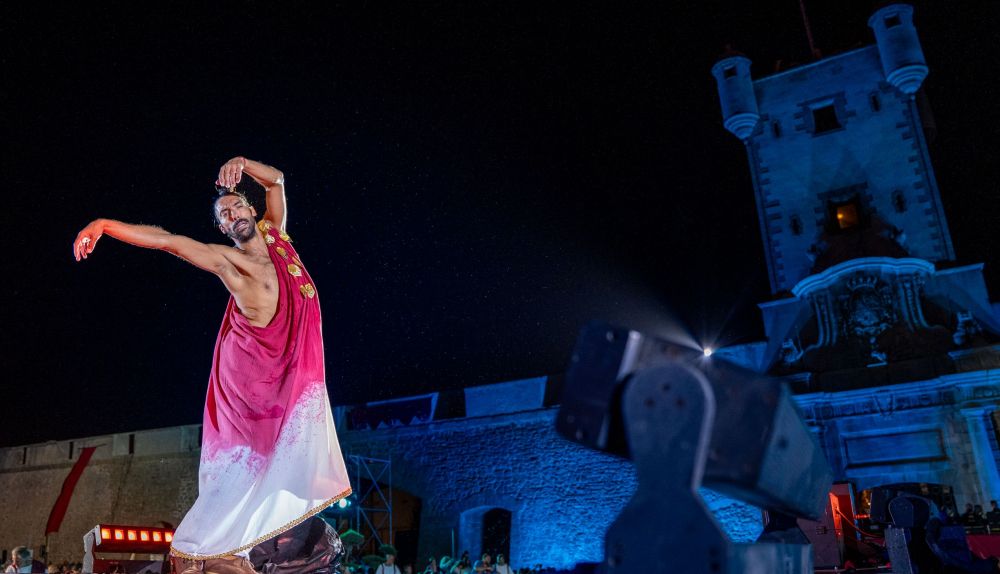Los 500 figurantes, coristas o bailarines participantes aprovecharon la potencia del entorno para introducir en la velada las fuentes que rodean las murallas o las vías que pasan bajo los arcos. La aparición de un velero romano por las calles elevó el pequeño asombro y hasta la pirotecnia tuvo su momento sobre la piedra ostionera.