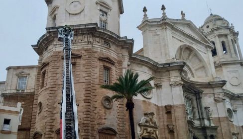 Los bomberos del Consorcio Provincial han actuado de urgencia este viernes en la Catedral de Cádiz después de un desprendimiento de piedras hacia la vía pública desde el campanario de Poniente, junto al Arco de la Rosa. Con un vehículo de escala, han subido a sanear el entorno del citado campanario, donde se han apreciado restos de piedra ostionera sobre los salientes. "Desde la estructura de un ventanal habían caído piezas de piedra ostionera de pequeño porte".