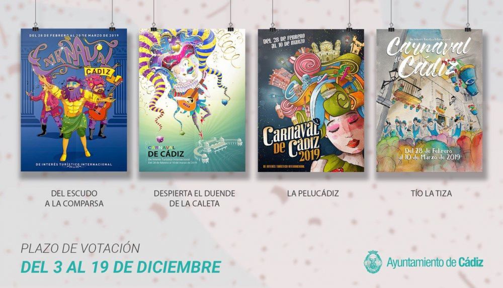 ádiz, 2 de diciembre de 2018. Este lunes, 3 de diciembre, se abre el plazo para que todos los gaditanos y gaditanas que estén empadronados en la ciudad de Cádiz y que posean DNI y correo electrónico puedan votar el cartel que promocionará el Carnaval de Cádiz 2019. Las votaciones se podrán hacer hasta el 19 de diciembre a través de una web habilitada para tal fin o en los ordenadores que se ubicarán en el vestíbulo del Centro Integral de la Mujer, donde se expondrán todas las obras presentadas al concurso, no solo las cuatro seleccionadas por el jurado para entrar en esta fase de la votación popular.