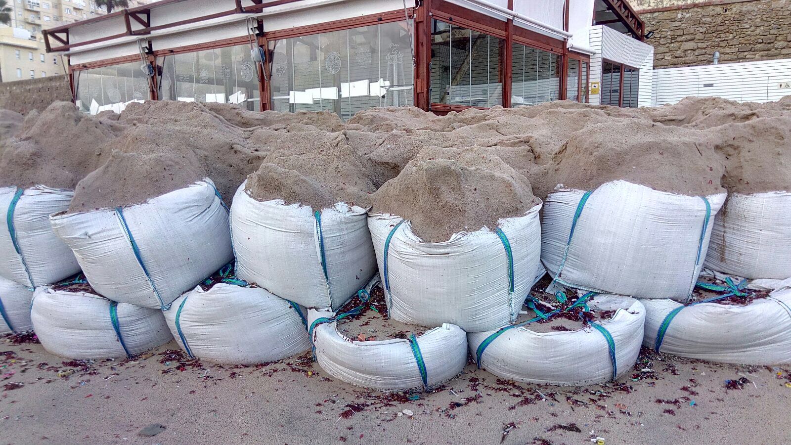 El Pikachos es el único negocio de la playa de Santa María del Mar, en Cádiz, que ha sobrevivido a la borrasca 'Emma' preservando su estructura con sacos de obra rellenos de arena alrededor del local.