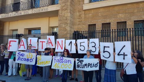 La concentración convocada por la APDHA en la puerta de la Subdelegación del Gobierno visibiliza los casi 16.000 refugiados que no han llegado a España cuando se cumple el plazo de acogida.