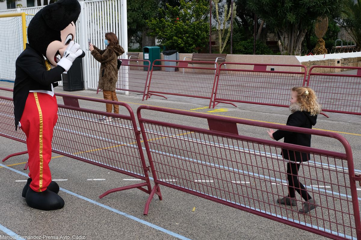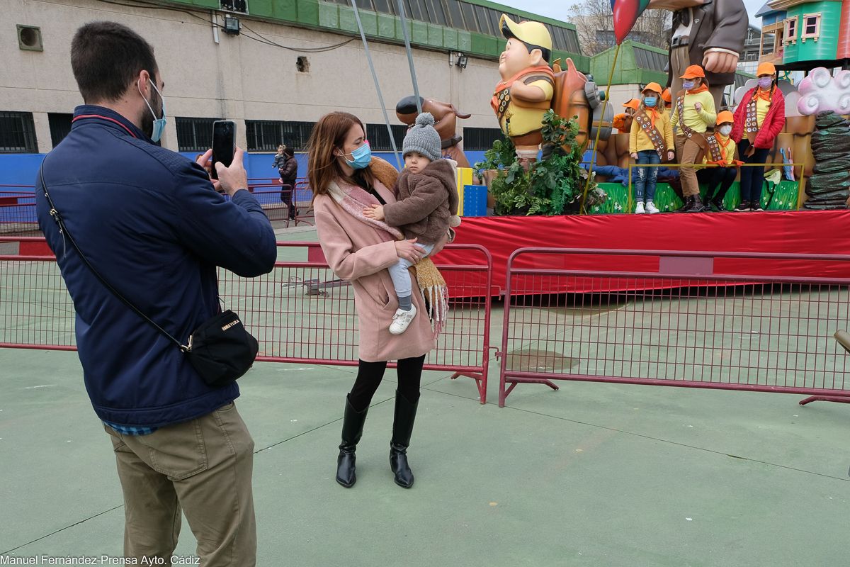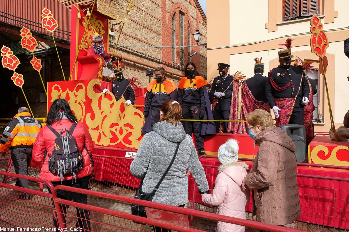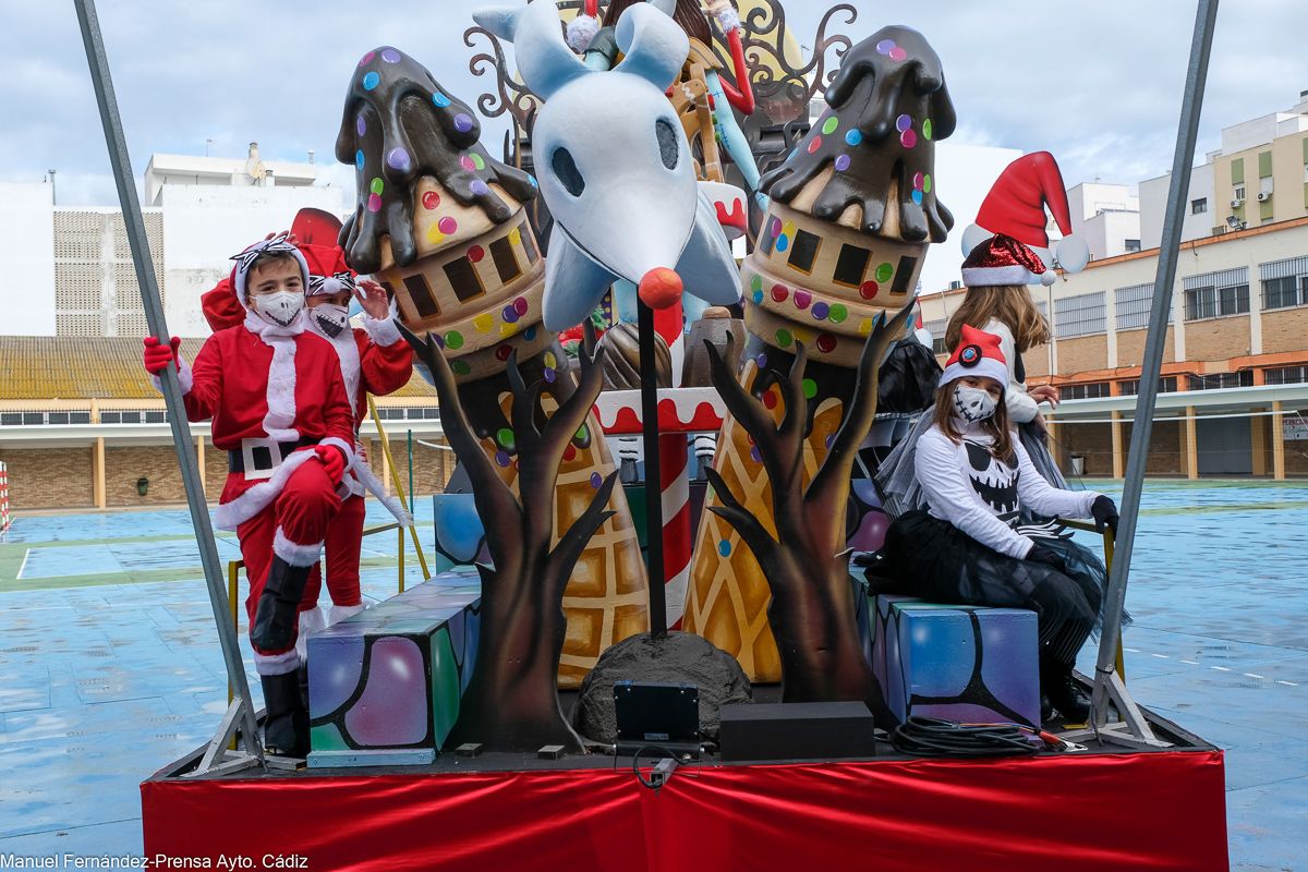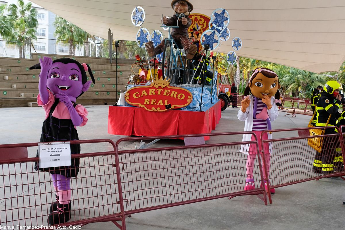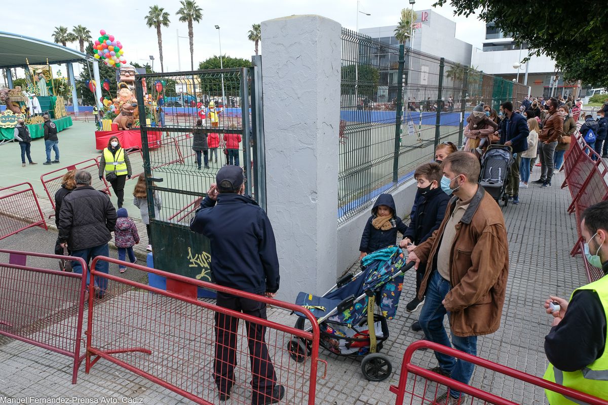 Numerosas carrozas estáticas se han colocado separadas con vallas en distintas zonas tanto del casco histórico como de extramuros comformando un circuito de lo más divertido a cargo del Ayuntamiento de Cádiz, a través de la Delegación de Cultura y Fiestas, y en colaboración con la Asociación de los Reyes Magos. Los rostros ilusionados de los niños se han dejado ver desde las 10:30 y hasta las 13:30 horas en el colegio San Felipe Neri, donde el Rey Melchor, encarnado por el comisario de la Policía Nacional, José Manuel Menacho ha saludado a los gaditanos. En el patio la carroza El Grinch también ha animado a las familias. Con prudencia los asistentes han accedido al centro con ganas de pasarlo en grande.