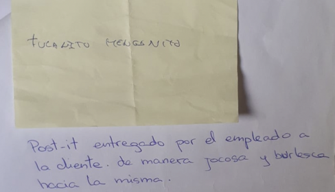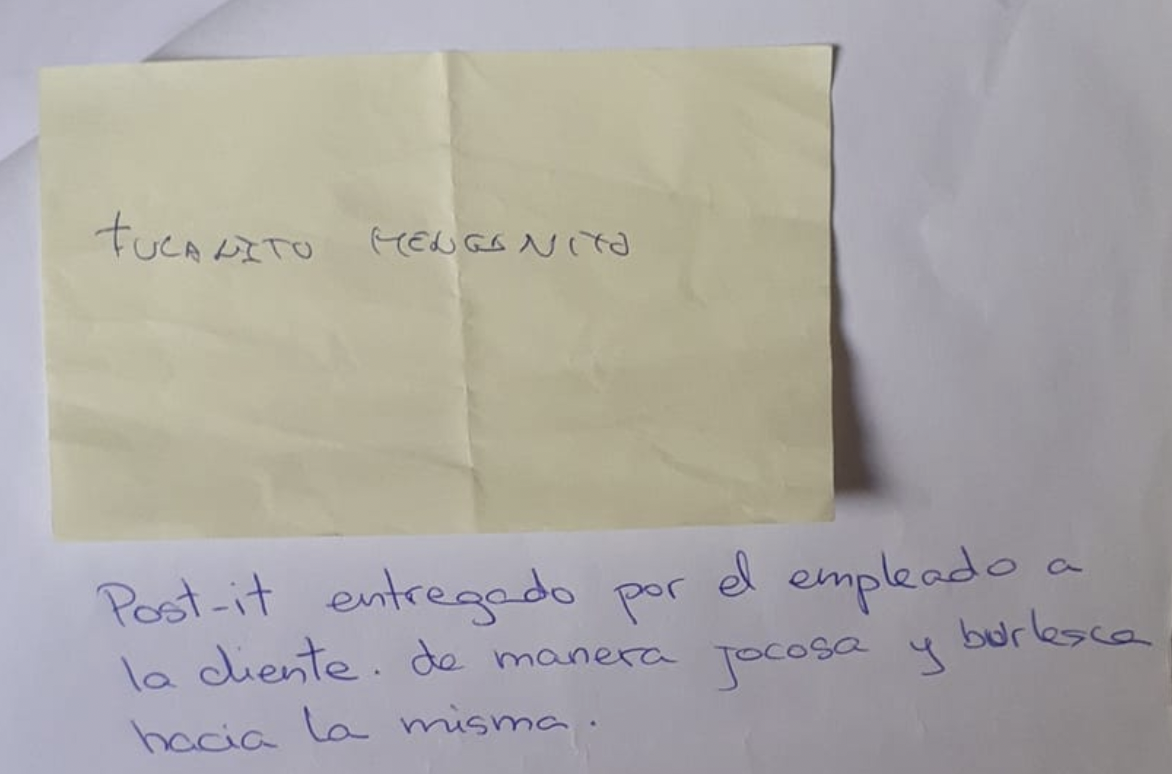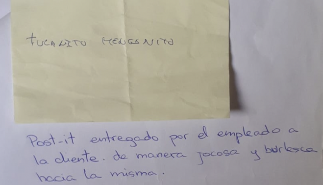 "Salí del bando y regresé para pedir su nombre y una hoja de reclamaciones. Vi al empleado reponiendo monedas en el cajero. Lo había solucionado sin haberme expresado que si esperaba un poco podría abonar mi recibo", explica. Además, cuando le solicitó la hoja, escribió en un post-it "Fulanito menganito" en lugar de identificarse y se lo entregó a la clienta.