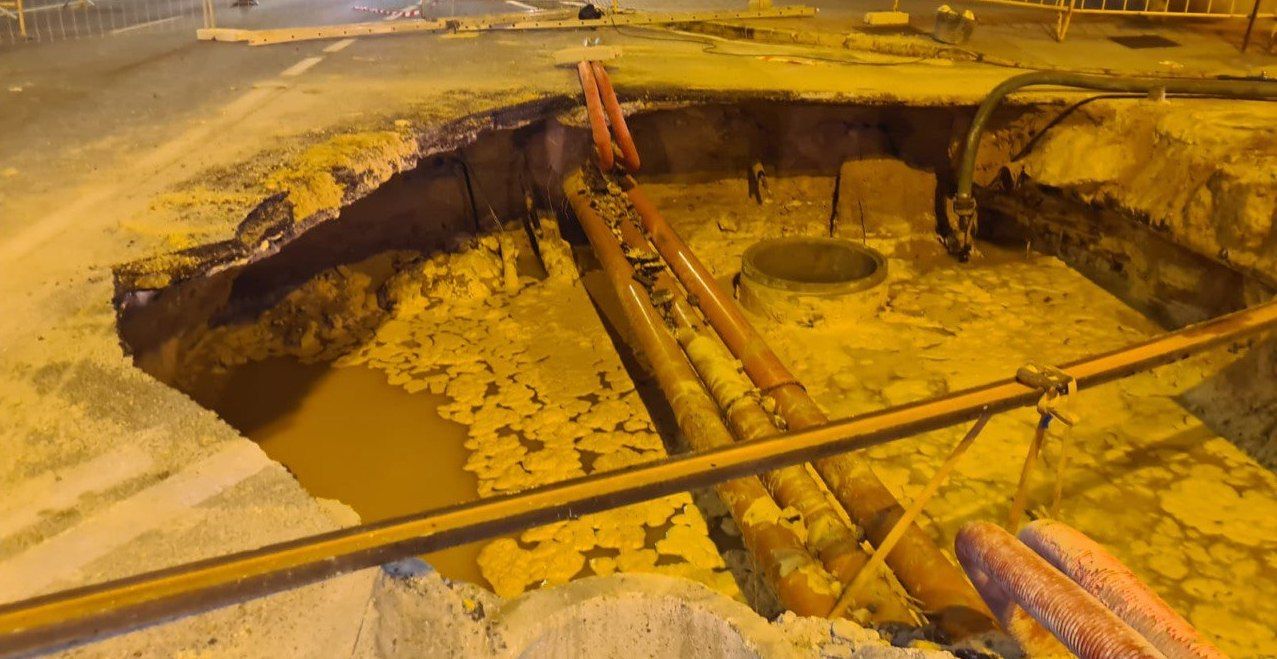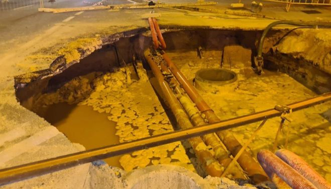 Los trabajos de reparación del socavón de la avenida Cayetano del Toro se han complicado durante la tarde de este viernes con la rotura de una tubería de abastecimiento de agua que ha provocado, a su vez, un aumento considerable del tamaño del socavón de la calzada, lo que ha obligado a cortar el tráfico en los dos carriles de entrada a Cádiz. Gracias a la rápida actuación de los técnicos y operarios de Aguas de Cádiz, se ha podido cortar la fuga de agua y controlar la situación en el menor tiempo posible.