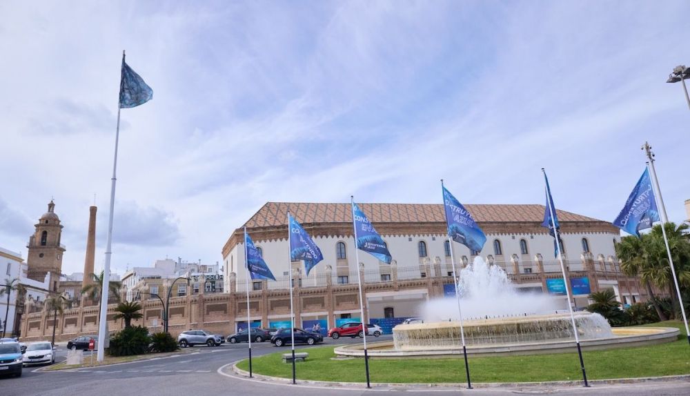 La Plaza de Sevilla, frente al Palacio de Congresos de Cádiz, ha sido hoy escenario del izado de una bandera muy especial en el marco del Blue Zone Forum Navalia Meeting 2025. Se trata de una pieza artística realizada a partir de una vela de barco reciclada, intervenida plásticamente para transformarse en un lienzo vibrante que evoca la esencia del mar y los océanos.