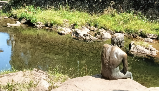 La fotografía de la partida de bautismo de Francisco de la Vega cuelga de la pared de esta infraestructura que del mismo vio construirse desde que era niño. Este hombre, vecino lierganés nacido en 1660 disfrutaba en el entorno donde hoy se encuentra una estatua en su honor. El motivo de que se acercara tantas veces a la que es una de las pozas más profundas del Miera se debe a que siempre había sentido especial atracción por el agua y llegó a alcanzar gran habilidad en la natación y una extraordinaria resistencia a la inmersión.