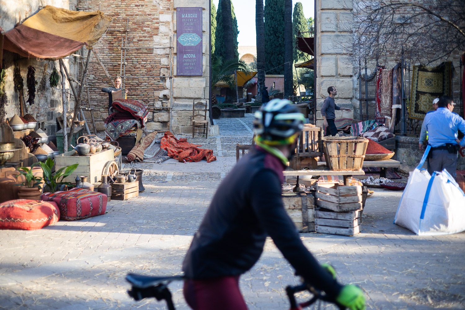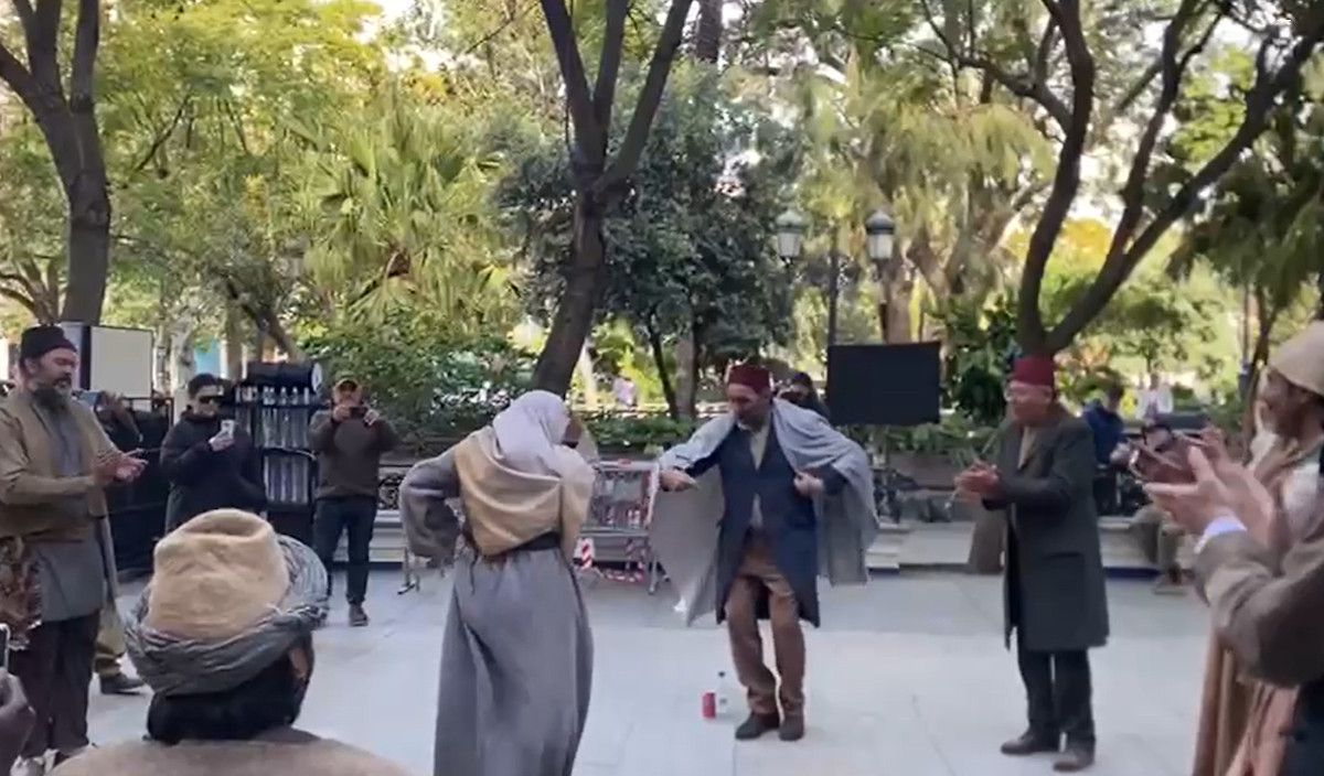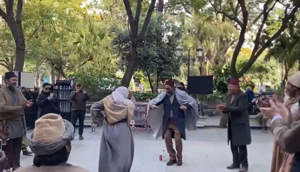 En la plaza de Mina, una de las localizaciones elegidas, junto a Argüelles y Candelaria, vecinos y comerciantes han sido testigos de una escena divertida. Algunos figurantes, procedentes del barrio de Santiago, en Jerez, se han arrancado por bulerías en un descando. Han cantando y bailado al ritmo de las palmas en mitad de esta emblemática plaza decorada.