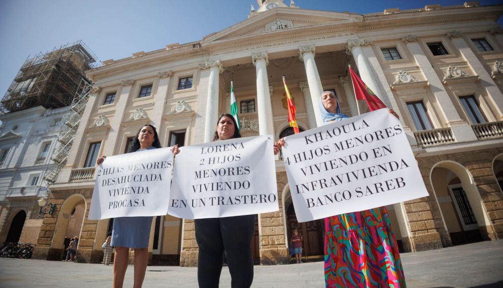 Tres madres que viven donde no quieren y con ocho menores de edad a su cargo escenificaron este lunes una situación de crisis social con la concentración conjunta que realizaron en el acceso principal al Ayuntamiento de Cádiz, en la plaza de San Juan de Dios.