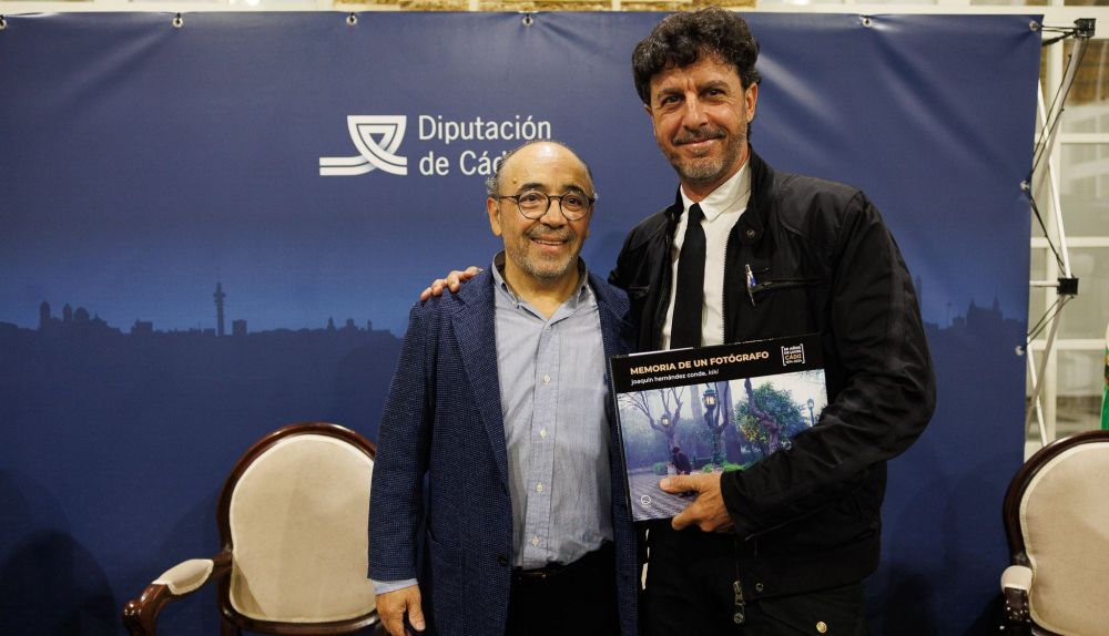 A la mitad de camino se pega un abrazo con Joaquín Hernández, Kiki, otra leyenda de la imagen con acento gaditano. Retoman en privado el diálogo que mantuvieron la noche previa, apenas 15 horas antes, en la atestada presentación del libro del último.