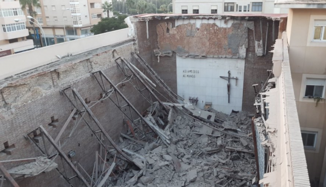 El colegio de Las Esclavas de Cádiz ha visto cómo en la mañana de este jueves se ha desprendido parte del techo de su iglesia. El suceso ha ocurrido entre las 07.30 y las 08.00 horas de la mañana, justo antes del comienzo de las clases.