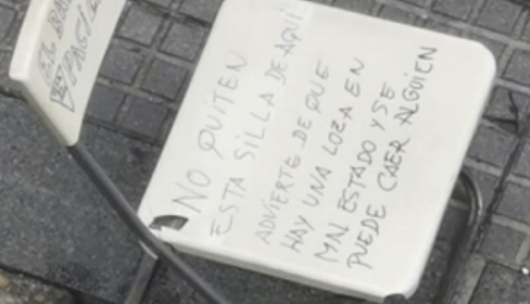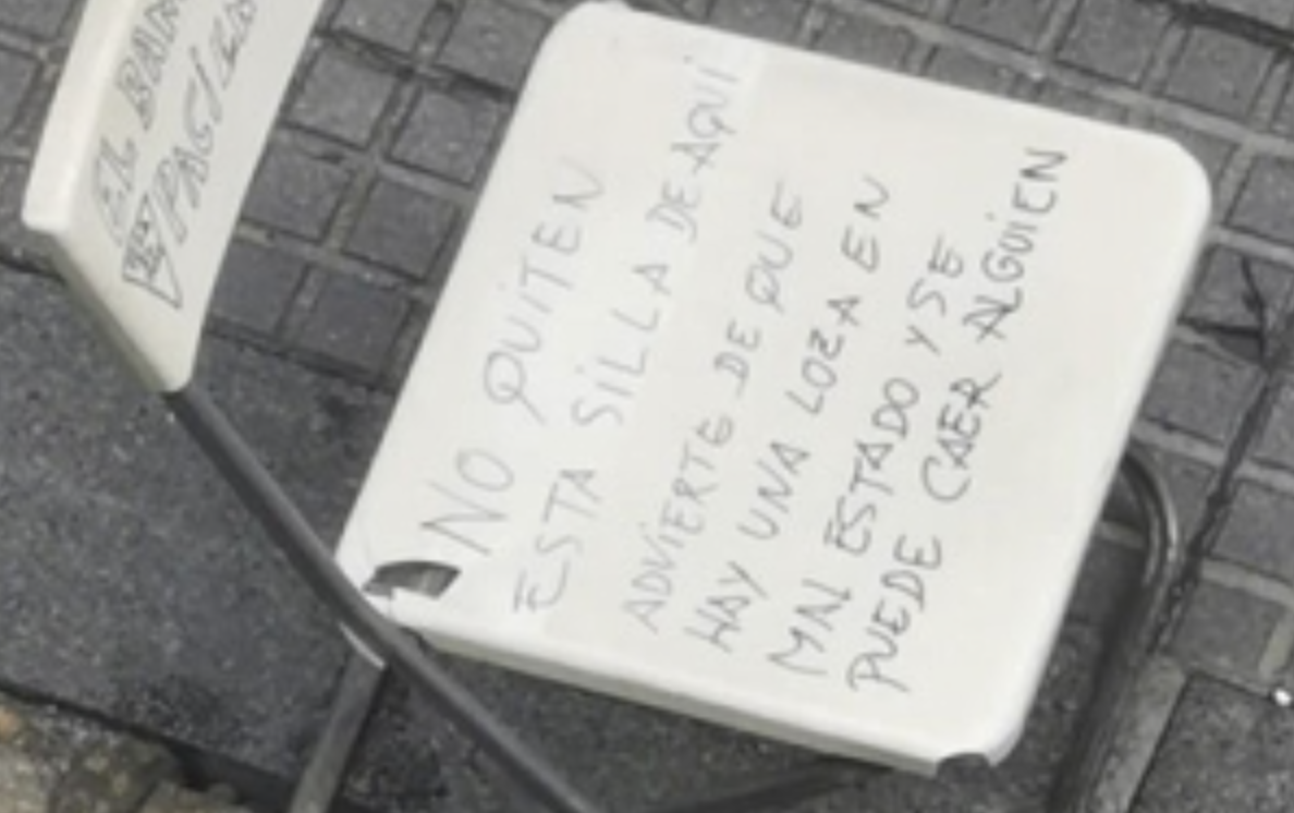 Según se observa en la imagen compartida por el portal gaditano, la silla, ubicada a la altura del número 31, frente a la tienda El Millonario, presenta un texto. "El bando de la paciencia", se lee junto al dibujo de una tortuga. La advertencia se observa en el asiento: "No quiten esta silla de aquí. Advierte que hay una losa en mal estado y se puede caer alguien".