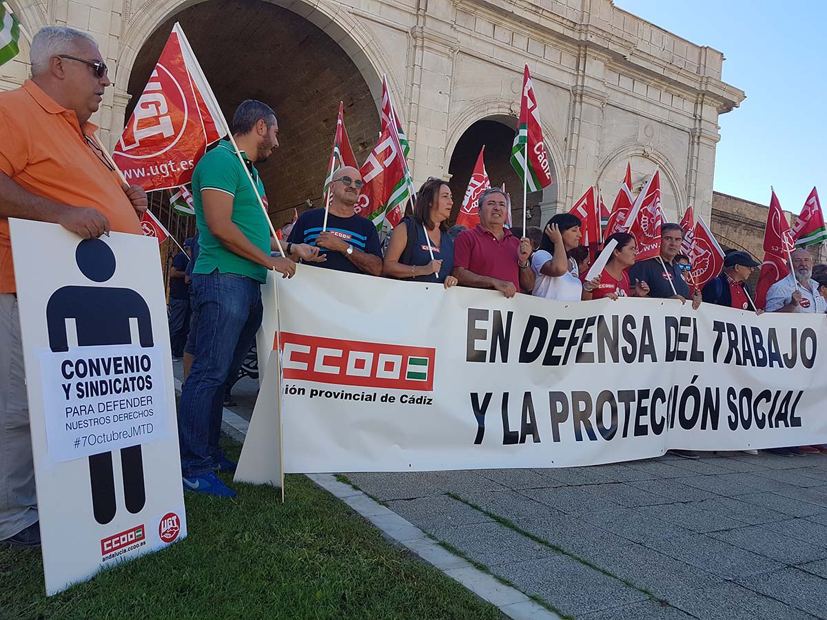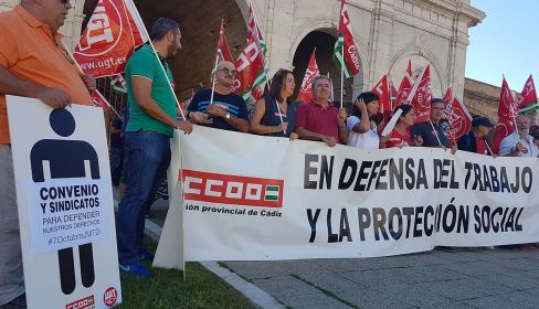 CCOO y UGT en Cádiz adelantan la Jornada Mundial por el Trabajo Decente y se concentran en las Puertas de Tierra, donde reclaman “salarios dignos, aumento del salario mínimo y un fortalecimiento del sistema de pensiones”.