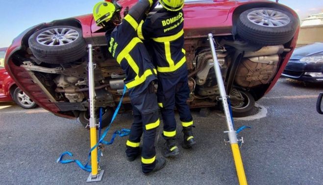 Un turismo quedó parcialmente volcado sobre su lateral derecho tras impactar contra otro vehículo que se encontraba estacionado. Como consecuencia, la conductora quedó atrapada en el interior del habitáculo, lo que hizo necesaria la presencia inmediata de los bomberos para garantizar su rescate en condiciones seguras.