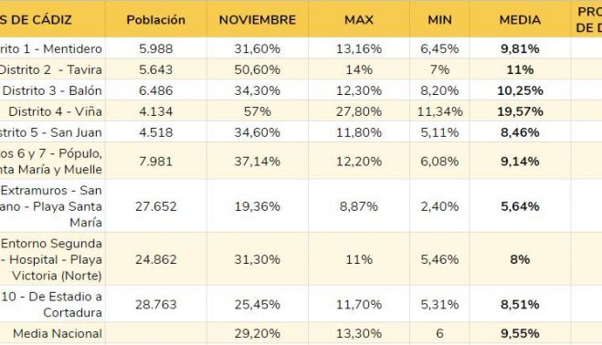 Así, todos los barrios de extramuros desde Cortadura están por debajo de la media nacional. En el entorno del hospital y el norte de playa Victoria, un 8%. Desde el Estadio hasta la salida de la ciudad por San Fernando, un 8,5%. También está por debajo la zona de Campo del Sur hasta San Juan. También, casi en la media nacional, el entorno de Pópulo, barrio de Santa María y Muelle (como se divide este distrito en el Instituto Nacional para este estudio).