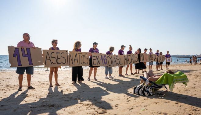 Con los pies en la arena y enormes pancartas. La organización Comisión 8M Cádiz ha lanzado un mensaje de concienciación este viernes 2 de agosto en la playa gaditana, repleta de bañistas en plena temporada alta. "El machismo no se va de vacaciones" es el lema de la marcha performances que el colectivo ha llevado a cabo junto a asociaciones feministas como Aghois, Jarana, Macondo, Amazonas y APDHA Cádiz.