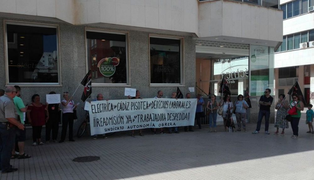Manifestación en Eléctrica de Cádiz para readmitir a una trabajadora. Integrantes del sindicato Autonomía Obrera han celebrado una concentración en las puertas de la compañía solicitando que se incorpore a su puesto de trabajo tras una sentencia favorable dictada el 20 de abril por el Juzgado de lo Social nº1 de Cádiz. Fuentes del sindicato explican que en la misma "condena a Eléctrica de Cádiz por prestamismo laboral, fraude en la contratación y despido improcedente de una trabajadora", obligando a la empresa a optar entre readmitir a la trabajadora o indemnizarla con 1.600 euros.