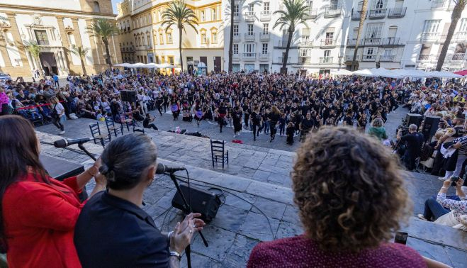 A partir de la hora señalada, la plaza se ha llenado de decenas de bailaoras y bailaores, de diferentes generaciones y nacionalidades, para desarrollar la coreografía que había propuesta previamente en las redes sociales la cantaora gaditana. El éxito de participación ha sido rotundo y ha desbordado todas las previsiones.