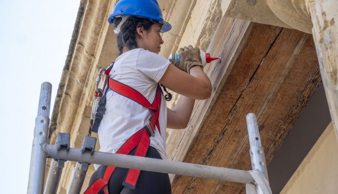 También se ha trabajado en las vigas de madera, donde se ha aplicado un tratamiento de limpieza y emplastecido, además de una protección preventiva frente a xilófagos, es decir, organismos que se alimentan de madera y pueden dañarla. La restauración integral también abarca la cerrajería del edificio, donde se han comenzado a aplicar tratamientos de protección en las rejas interiores.